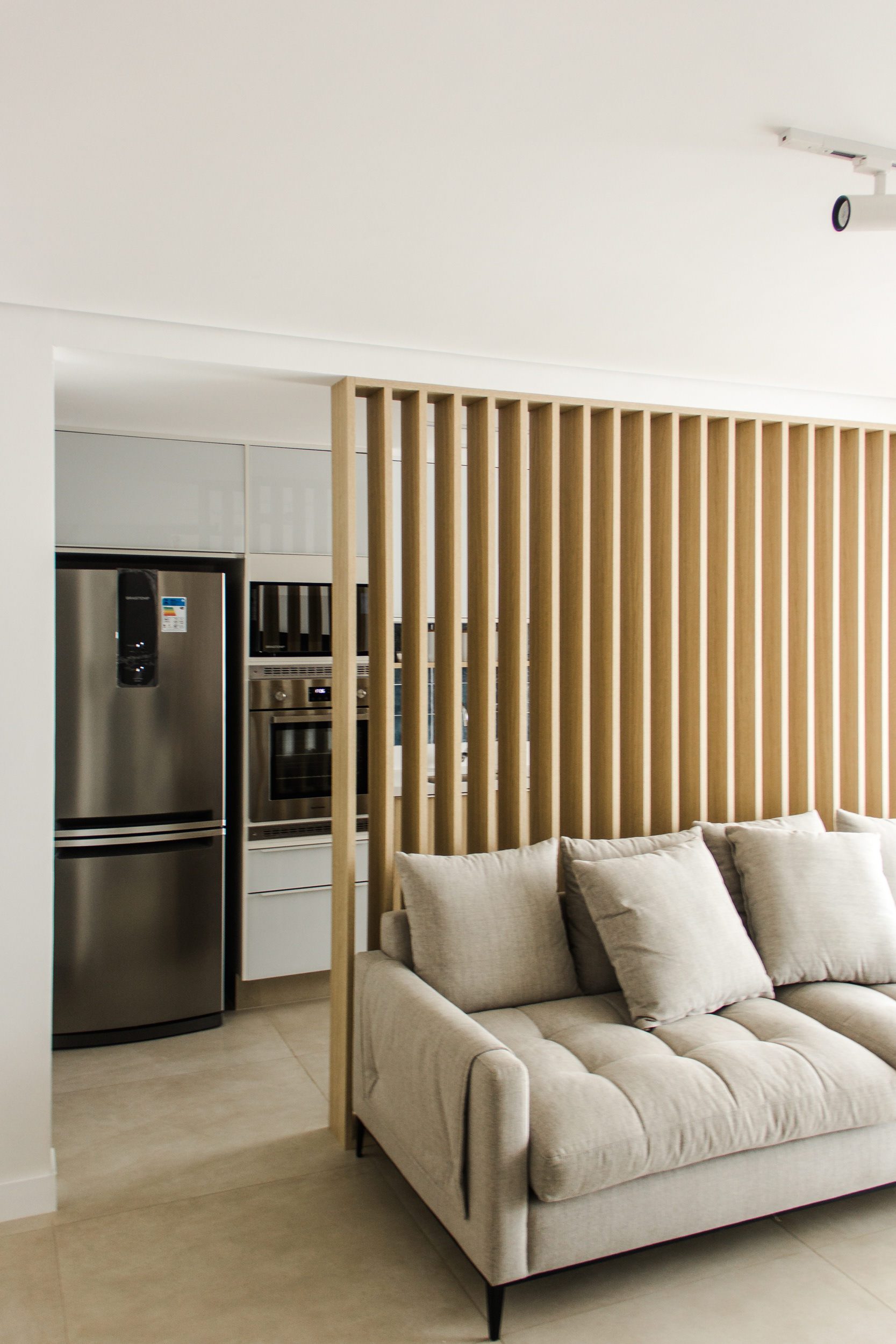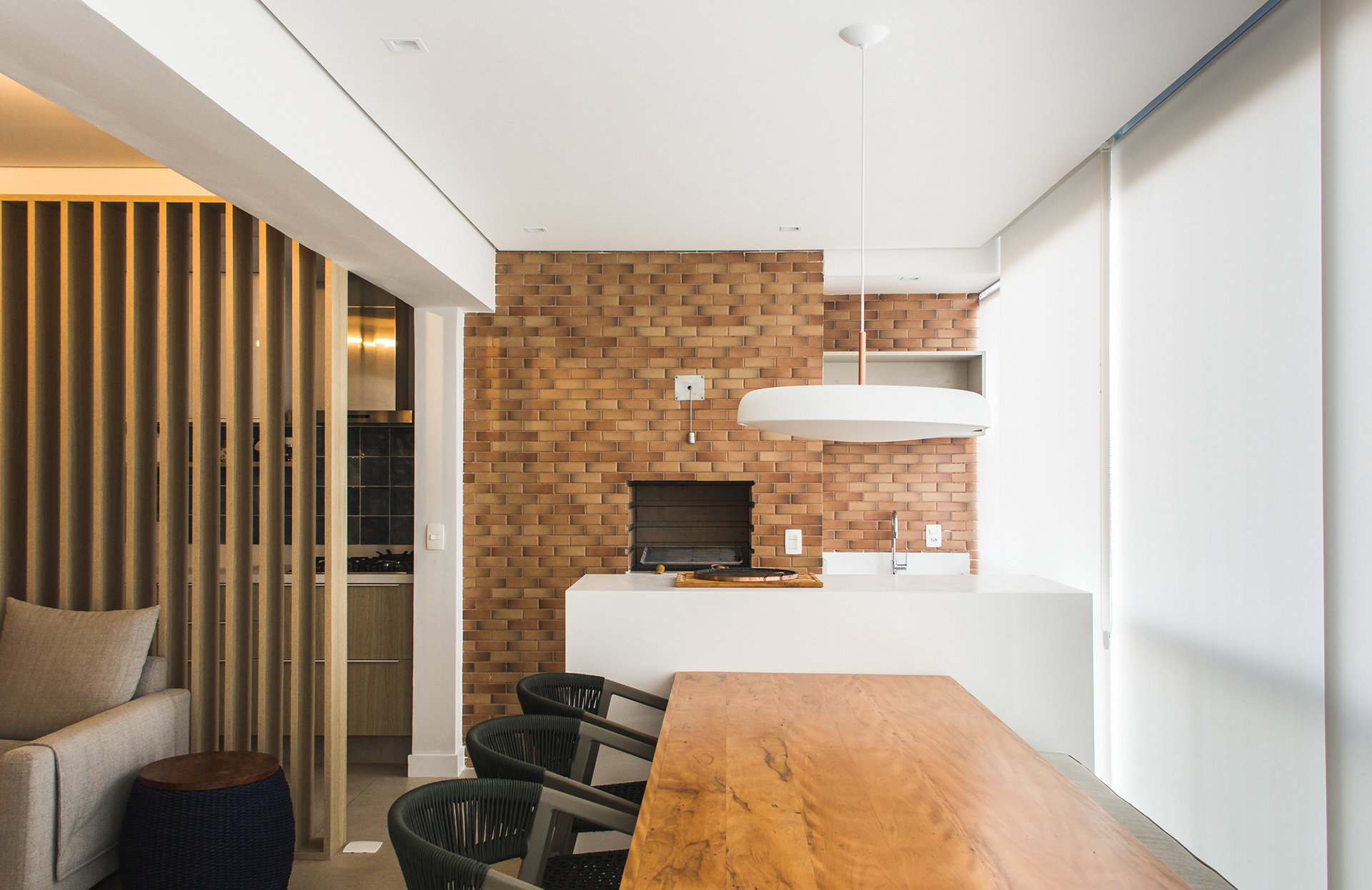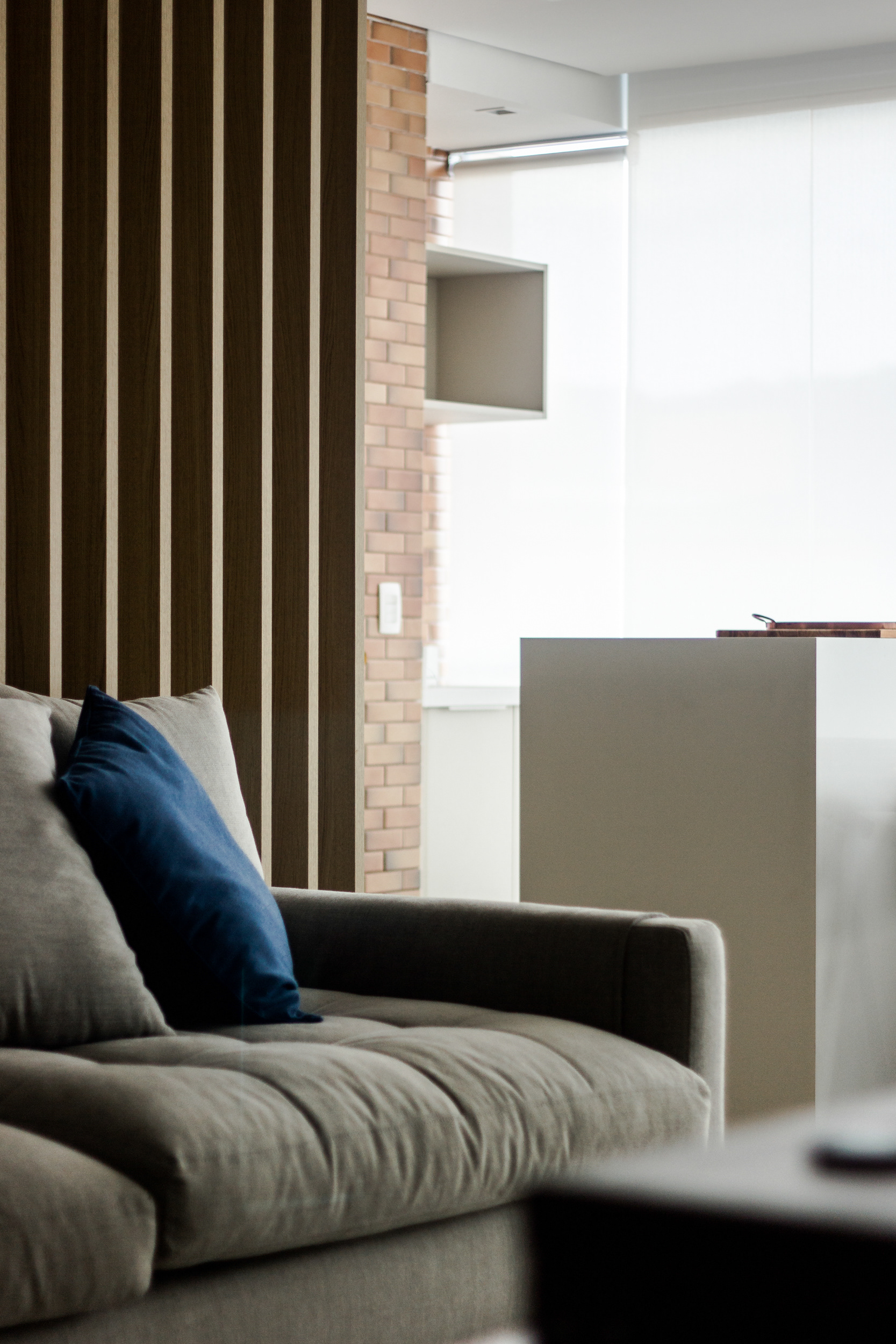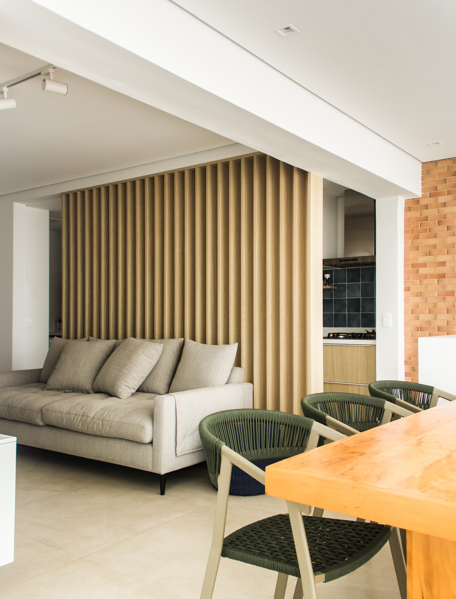 O painel ripado é o protagonista e divide a cozinha do restante da área social do apartamento mantendo contato visual entre os ambientes além de permitir a circulação de ar e entrada de luz natural. O quartzo branco e as diferentes tonalidades de madeira conversam e buscam integração com o revestimento de tijolinho original da fachada do prédio. As linhas ortogonais marcam a volumetria.