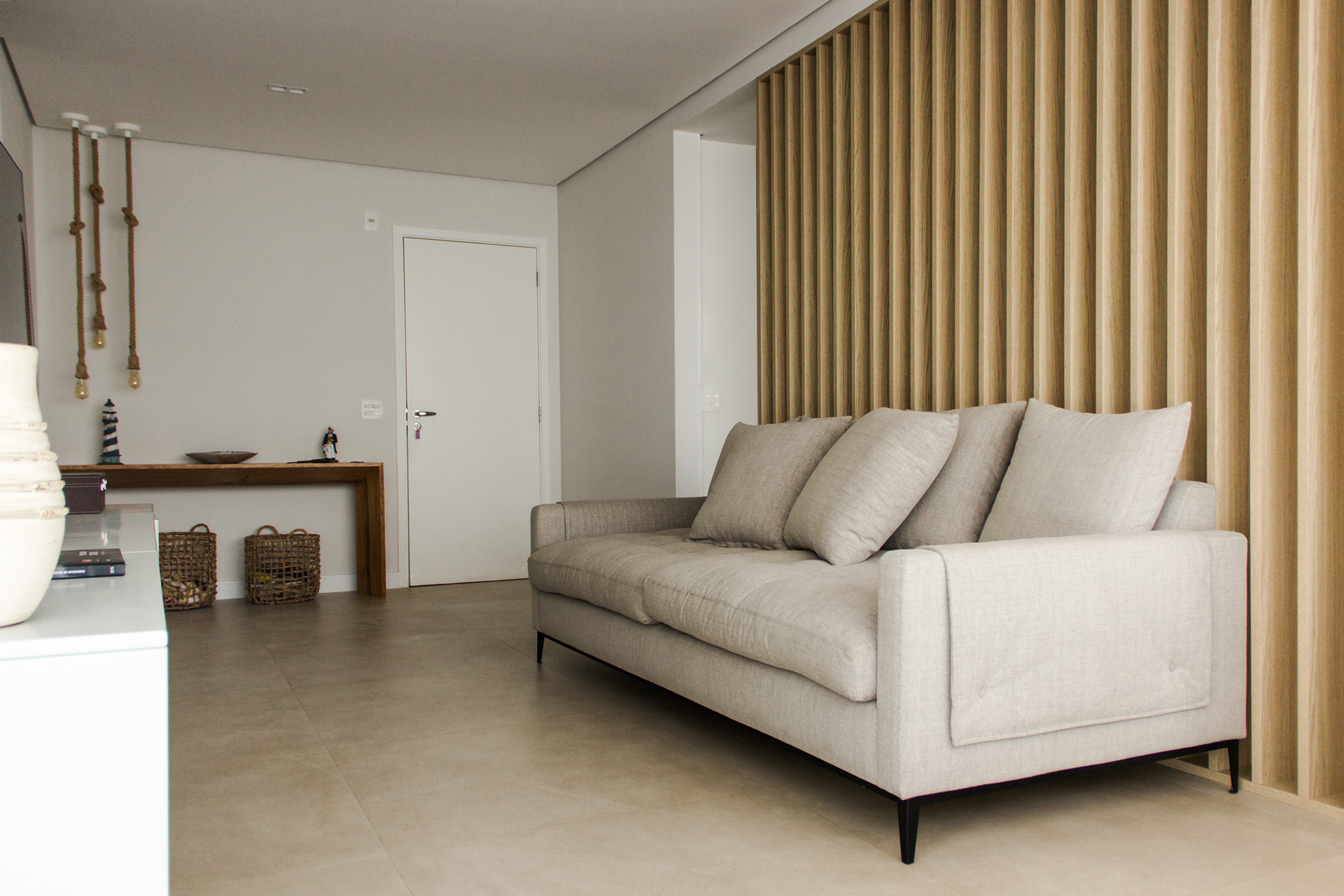 Localizado próximo a praia da Enseada no Guarujá, litoral sul paulista, o apartamento de veraneio busca proporcionar aos clientes momentos de paz e tranquilidade longe da correria do dia a dia e dos compromissos profissionais. Com base nisso optamos por uma paleta de cores neutras (preferencialmente claras) com pequenos detalhes em tons mais vivos em todos os ambientes. A demolição do caixilho que antes dividia o terraço e o nivelamento do piso, foram as principais intervenções na planta original do apartamento que teve como premissa o aproveitamento de alguns elementos e revestimentos entregues pela construtora como, por exemplo, o tijolinho na área gourmet.